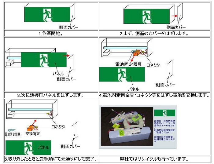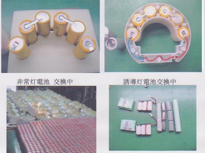 非常灯・誘導灯の電池は本体と別になっていますから、本体と電池ケースを弊社指定工場に送っていただければ、数日で新品電池に交換、ケース・本体は再利用して作動確認検査をしたうえで発送いたします。器具に不具合がある場合は無償修理いたします。