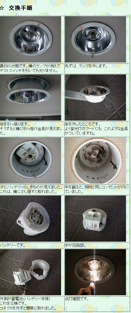 非常灯のバッテリー交換方法 バッテリー交換方法ですがネットで「非常灯バッテリー交換」で検索していただければ交換方法を説明したサイトがヒットします。特に分かりやすい動画もアップされていますので参考にしてください。参考にしてください。 参考ページhttps://www.denchiya.net/lp/maruwakari/hijyoto-koukan/index.html